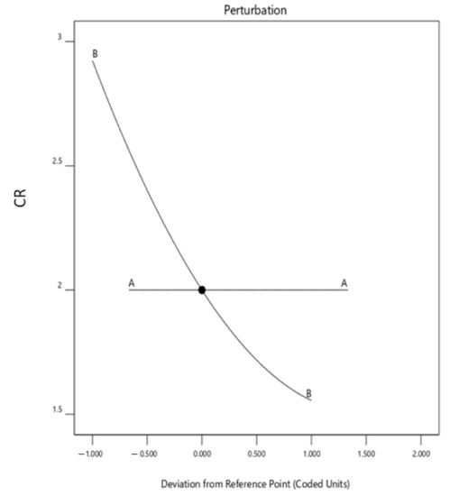 The fit statistical data for the third response, i.e., concentration ratio (CR), is given in Table 5. The values of R2, adjusted R2, predicted R2, and adequate precision are 0.99, 0.99, 0.98, and 90.94, respectively, which indicated that the selected model for CR is significant. The values of adjusted R2 and predicted R2 have a negligibly small difference from each other, which confirms the adequacy of the model for predicting the relevant parameter. Adequate precision is exceptionally high in this case. The model possesses a high enough signal for optimization, which is an eminently desirable feature.