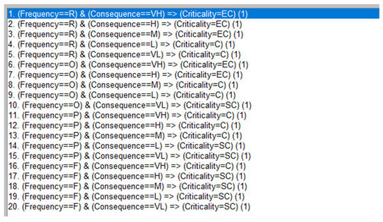 The mapping of frequency, consequences and criticality values was achieved by using Fuzzy If-Then rules of crisp inputs and outputs applied to the Fuzzy logic toolbox kit of MATLAB R2020b. A total of 20 If-Then rules were utilised in the FIS to provide the mapping. The rules are designed to follow the logic of the expert assessor derived from the qualitative criticality matrix and are outlined in Table 6. The parametric membership functions for inputs and output variables can be found in Table 7.