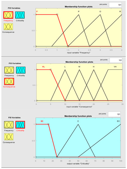Figure 4. Fuzzy membership functions plots for frequency, consequences and criticality.
