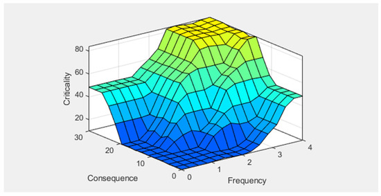 An examination of the plot of criticalities’ surface over the possible combinations of the input variables (frequency and consequences) shows consistency of the rule base used for the criticality assessment. Furthermore, Figure 5 reveals no evidence of abrupt changes in the output variable (criticality) for small changes to the input variables range.