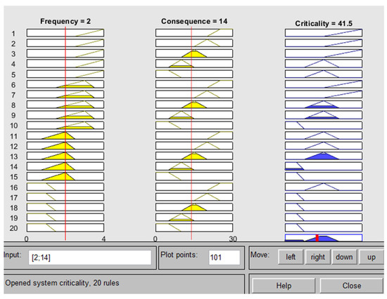 A rule view and an example calculation of criticality value for a MoOSTs task are shown in Figure 6. The calculation has been performed for a MoOSTs task with a frequency of 2 and a consequence of 14. The criticality value estimated by the FIS is 41.5, and the corresponding linguistic value is EC (using the MFs in Figure 4). A comparison of criticality values obtained from the traditional criticality assessment and Fuzzy criticality output was performed after recording each numerical output and linguistic value against individual MoOSTs task.
