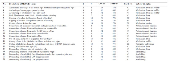 To implement the proposed decision method, it is vital to deduce a logical procedure for carefully selecting the most relevant MoOSTs activities that would benefit from criticality assessment of task-bask-based expertise identification and codification framework. MoOSTs data embedded within the plant’s CMMS that spans over a 5-year time window was utilised for the analysis. The RKS was selected because it was adjudged be to be of utmost importance in maintaining smooth-running operations of cement manufacturing [25]. Maintenance tasks for each critical sub-units under the RKS were assessed to determine criticality based on a combination of relevant factors [19]. A criticality assessment technique, applied by Crespo et al. [24], was adopted and modified to suit the specificity of this study’s elements. The two main parameters considered were task frequency (F) and consequence (C). The mathematical relationship depicted in Equation (1) was applied to harmonise all the parameters and factors. Additionally, strict weighting protocols were implemented to yield task-based criticality assessment values (Cav) that adequately assessed maintenance tasks that fall within the premise of RKS during MoOSTs. Furthermore, a linguistic command classification system was used to assign ratings as well as multi-disciplinary requirements. It is also envisaged that this approach could foster the reduction of MoOSTs task uncertainties through incorporation into a dedicated knowledge management system.