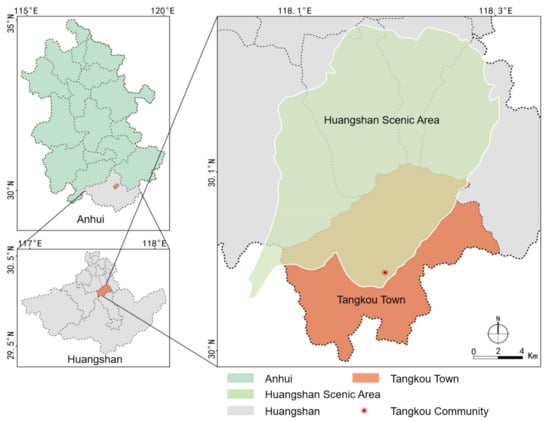 Located in the southern part of Anhui Province, the Huangshan Scenic Area is a typical mountain scenic spot, which is listed in China’s top ten scenic spots together with the Great Wall and the Forbidden City. Huangshan was inscribed on the World Heritage List in 1989 for its unique natural scenery and rare structure of peaks. Tangkou town includes Tangkou community, Zhaixi community, and other four villages, which are located away from the south gate of the scenic area only 1 KM, is a typical heritage community (Figure 1). Historically, Tangkou town was a poor and isolated rural area in China where forest tea was the main crop. Since the development of Huangshan tourism in 1978, Tangkou town has been the main hub for tourists visiting the scenic area, undertakes tourist distribution, accommodation and reception functions, commercial services, and provide accommodation for the staff. The number of tourists has increased every year, people from other parts of Anhui Province or other provinces in China come to Tangkou to work in tourism-related jobs. A corresponding increase in the number of tourist service facilities and practitioners, has promoted the continuous expansion and reorganization of the community. By 1997, Tangkou town had become the largest tourist reception and distribution center of Huangshan, with nearly 400 individual businesses of all kinds in the village, including more than 200 individual hotels with 6000 beds. There is a plethora of small shops and restaurants, and the commercial facilities are extremely dense. The associated influx of migrants has led to a chaotic residential population, environmental degradation, and many social problems.