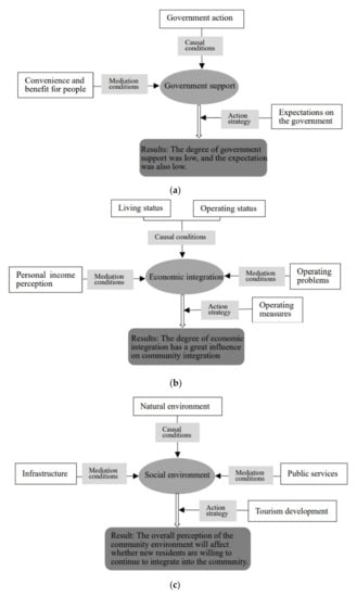 The chain of evidence for economic integration (Figure 2b) is as follows: The living and operating status of the residents are the prerequisites for the economic integration of new residents. New residents’ perceptions of personal income and operating problems are intermediary conditions for economic integration. The measures proposed by the new residents to address the operating problems are the action strategies of economic integration.
