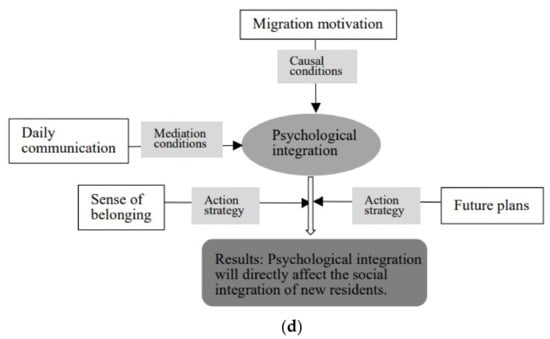 The chain of evidence for psychological integration (Figure 2d) is as follows: The motivation for moving in determines whether residents have chosen to join the community, which is a prerequisite for psychological integration. Daily communication is the intermediary condition for psychological integration. A sense of belonging and planning for the future are action strategies for psychological integration.