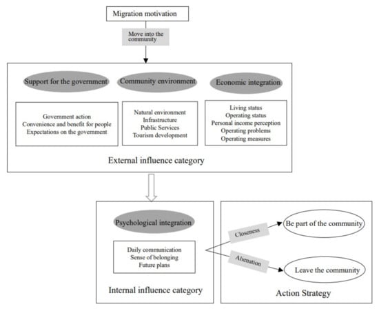 Quantitative research methods have been adopted in previous studies of immigrants to tourist destinations. For example, Lu et al. [] used a questionnaire survey to study the tourism immigrants in Hongcun, and Yang et al. [] combined field observation and interviews to examine the settlement characteristics of Qiandao Lake. However, no studies of community integration in this domain have taken a grounded theory approach.