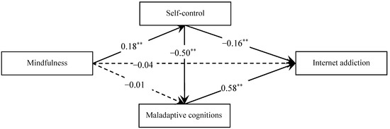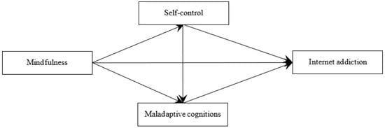 Additionally, existing studies have found Internet addiction mainly results from a failure of self-regulation due to a lack of self-control (which can be defined as the capacity to stick to a long-term goal by resisting inner desires and external temptations), which makes individuals unable to resist an increasing craving and prevents the transition from normal use to addiction [14,15]. In self-regulation theory, a lack of self-control can lead to failure in self-regulation; individuals with little self-regulation have difficulty resisting an increasing craving to use the Internet, which in turn leads to addictive behaviors [10,11]. Fortunately, mindfulness, as the deliberate self-control of attention, consists of being aware of the present experience. Therefore, self-control is another factor protecting against Internet addiction. Numerous researchers have reported that mindfulness is positively related to the level of self-control [25,26,27]. Thus, mindfulness may prevent Internet addiction symptoms through increasing self-control. Additionally, Song and Park reported that individuals with low self-control tend to experience Internet addiction by developing maladaptive cognitions about the Internet [28]. This self-control tends to be a distal protective predictor of Internet addiction. In the cognitive–behavioral model, mindfulness may also prevent Internet addiction through self-control and maladaptive cognitions. Thus, this study explored the possible mediators of the path from mindfulness to Internet addiction.