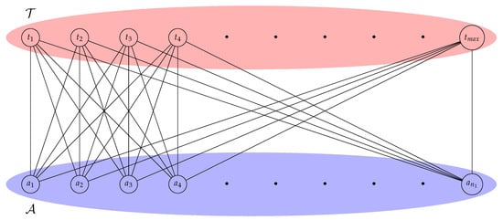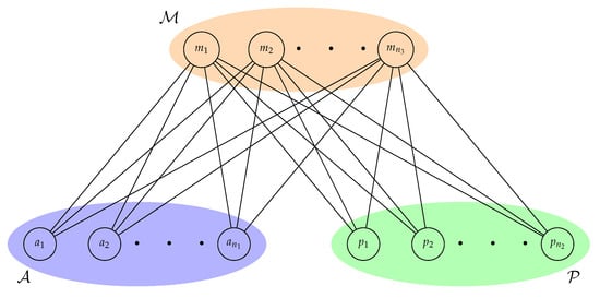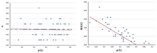 This measure does not incorporate the weight of the edges in its analysis, so that in [] it is defined the measure called Medium Articulation () that obtains its maximum for networks with a medium number of edges, whereas it vanishes for extremal networks (null and complete networks). Now, note that the network of the geometric model is bipartite, taking , where and . Thus, the measure reaches the maximum when the bipartite network is complete, and it attains the minimum when there are no edges in the network (the total number of edges in the complete bipartite networks is about half of the total number of possible edges) defined by: