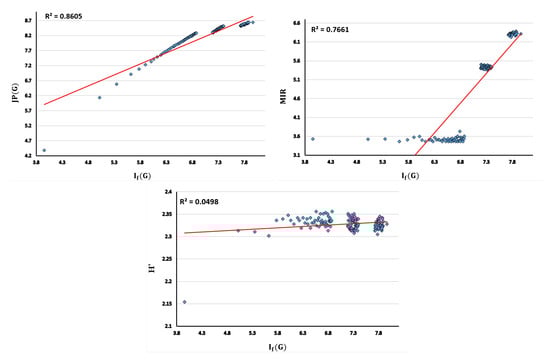 Scatter plots between the index and the , MIR and Shannon diversity indices for the 150 random networks constructed above. The index values are normalized with the function .