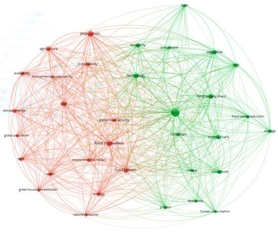 The bibliometric technique of term co-occurrence allows to identify the main thematic streams in the literature on the implications of FLW on food security. The 34 most relevant terms included in the titles and abstracts of the sample of 327 documents were extracted using the binary counting method in the VOSViewer programme [31]. Considering only the presence or absence of a term in a document, the binary counting method identified 9250 terms of which only 127 terms met the threshold of the minimum number of occurrences of a term. The threshold, set equal to 5% of the total number of documents in the sample, was 16. VOSViewer automatically extracted the 60% most relevant of the 127 terms (i.e., 76 terms). The final number of terms (34) was obtained by removing irrelevant terms from those 76 terms: they are listed in Table A1 in Appendix A. Figure 2 shows the relationships between the most relevant terms in the literature related to FLW and food security. Shorter distances between terms in the network indicate stronger relationships between them. Based on the frequency of co-occurrence, the most relevant terms are also classified into two main clusters (i.e., thematic areas within the literature on the nexus between FLW and food security): “Water-Energy-Food Security nexus” (red cluster), and “Reduction of food loss and food waste” (green cluster). Closer relationships occur between terms in the same thematic cluster. The red cluster, associated with resource-related keywords such as energy, water and land, identifies the research area dedicated to the sustainable use of natural resources, especially in the context of food production, from the perspective of global food security. The cluster appears to be methodological oriented, concerning analyses of the environmental impacts and greenhouse gas emissions associated with agriculture and food systems. The green cluster is associated with keywords that hint at food waste reduction (e.g., storage, technology, policymaker, economy) to achieve the goal of food security. A particular attention is devoted to perishable products such as fruit and vegetable that are more likely to be wasted.
