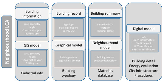 11] facilitating detailed information for European cities which can be easily matched for other world regions. The associated model presented can be easily exported for assessing sustainable construction strategies for urban renewal at neighbourhood level and are the basis for a future research proposal.