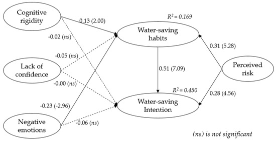 Numerous studies have shown that habits may mediate the relationship between personal antecedents and future behavior [72]. Habits, as explained in relation to the first hypothesis, are learned or automatized routines that do not demand conscious intention [23]. A basic assumption behind the mediating role of habits is based on the idea that personal variables such as personality (i.e., RC dimensions) and attitudes (i.e., perceived risk) are broad, general constructs that operate over time and situations. Thus, they should be further from intended behavior than habits. Accordingly, the personal antecedents of the future intention of saving water mentioned in Hypotheses 2 to 5 (i.e., cognitive rigidity, lack of confidence, negative emotions, and perceived risk) are also expected to exert an indirect influence on such intentions through their direct influence on habits. Specifically, the hypotheses proposed are as follows: