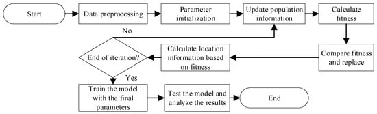Referring to Equation (18), the position information and fitness of each grey wolf are recalculated. RMSE is an important index to evaluate the validity of the model. In particular, the smaller the RMSE, the better the model. If the RMSE of grey wolf is less than that for a certain grey wolf in the grey wolves of , replacement will be carried out. For example, the RMSE of grey wolf is smaller than that of grey wolf , and then the position information and fitness of grey wolf will be replaced by grey wolf . At the same time, grey wolf and exchange their position information and fitness with each other.