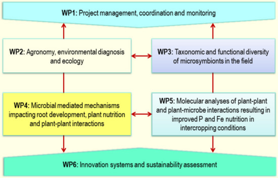 We propose an interdisciplinary approach combining soil microbiology and ecology, agronomy, ecophysiology, plant physiology and molecular biology, and socioeconomic analysis in order to identify the best-performing associations of crop genotypes for low (N and P) input agriculture. This project is based on a combination of research conducted in controlled conditions (from the scale of mesocosm to field plot in experimental stations) and participatory research (in a network of farmers’ plots) (Figure 3). Our central hypothesis is that the performance of a crop plant community in terms of nutrient acquisition and use efficiency can be explained by ecological concepts such as facilitation and niche complementarity. We assume that these processes are enhanced in complex plant communities and at low levels of soil N, P, and Fe resource availability. In order to choose the best-performing associations (in Mediterranean agroecosystems) of species or genotypes, the ambitious objective of the project is to increase our understanding of plant–plant and plant–microbe interactions that underlie functional complementarity and facilitation/competition. The ambition is large since the rhizosphere is here considered with a broad view. The recent discovery by our consortium that some rhizobial strains can behave as bona fide PGPB upon interaction with some durum wheat cultivars in a way similar to that we have recently reported in Arabidopsis thaliana [32] actually opens very novel and stimulating perspectives.