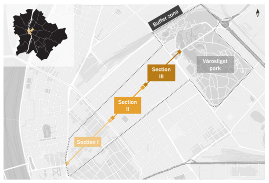 The first section, or inner part, comprehends Bajcsy-Zsilinszky—Oktogon; the second, middle part, is from Oktogon to Kodály körönd; the third, outer part, extends from Kodály körönd to Heroes Squares. Within the main sections, we can differentiate subsections bordered by crossing streets and the two main squares—Oktogon and Kodály körönd—and the Heroes’ Square at the City Park termination (Figure 4).