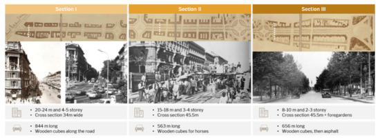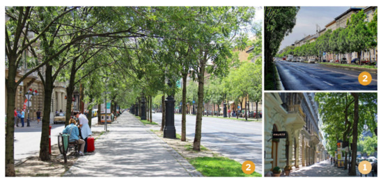 Stressful urban habitat along Andrássy Avenue, Section 2. and 1. (edited by Rosa & Lahmar; source: http://holpihenj.com/andrassy-ut/ (accessed on 27 February 2021)).