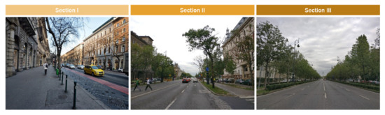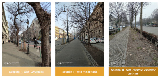 The three sections and their typical urban landscape character. (Section 1. Celtis occidentalis; Section 2. Fraxinus excelsior; Section 3. Fraxinus excelsior ‘Westhof’s Glorie’. (edited by Szilágyi, K.; source: https://www.nomadepicureans.com/europe/hungary/free-budapest-walking-tour-self-guided/ (accessed on 27 February 2021)).
