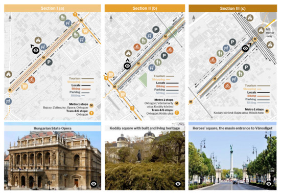Urban context, functions, monuments and character; (a) Section 1; (b) Section 2; (c) Section 3. (edited by Rosa & Lahmar; sources: https://pocketoz.com.au/suitcase/dest-budapest.html (accessed on 27 February 2021); https://www.budapesttips.co.uk/budapest-attractions/opera-budapest/ (accessed on 27 February 2021).