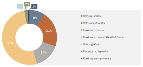 Due to the several replantation periods and the variable planting design, uniformity is only characteristic in the third section. The first part contains old and younger trees, where older ones are Celtis occidentalis, while the younger, newly replanted trees are Celtis australis and C. occidentalis mixed. The taxa confusion is more significant in the second section. Some old sycamores and a single Ulmus glabra stand there, with several Fraxinus taxa. The last year’s replantation resulted in a new taxon, the Celtis australis appearing in the first and middle sections (Figure 9).