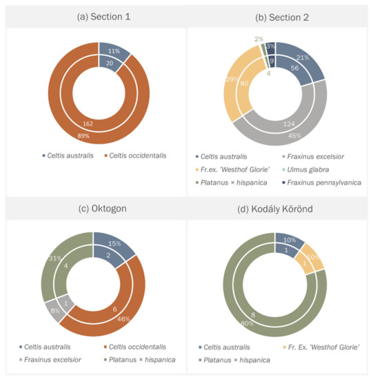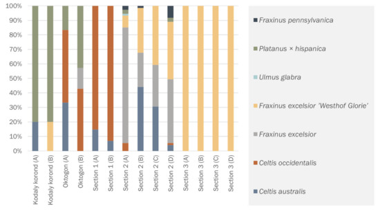 Seven different taxa live nowadays in the allée owing to several reconstructions and renewals (Figure 8). There are still some old individuals, such as the sycamore trees (Platanus × hispanica) from the first plantation on Kodály körönd square, and in the second section from the replantation program after WW1. Old Celtis trees are still in Section 1, and one single old elm tree (Ulmus glabra) planted in 1949 stands in the middle area. Hackberries (Celtis spp.) grow in the squares too. The first and second sections show a great variety in the time dimension.