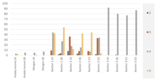 Based on Rado’s value (see Appendix A), the relationships of roots, root collars and planting circumstances are different among places and sections. Individuals who did not show any abnormal symptoms (ground cracks, root congestion, girdling roots, damaged roots, bark, phloem, xylem injury, fungal infection, etc.) received excellent values. The highest value (5) is characteristic in the second section due to the many new replanted trees; good and medium values are typical in the first section thanks to healthy rooted individuals (Figure 11).