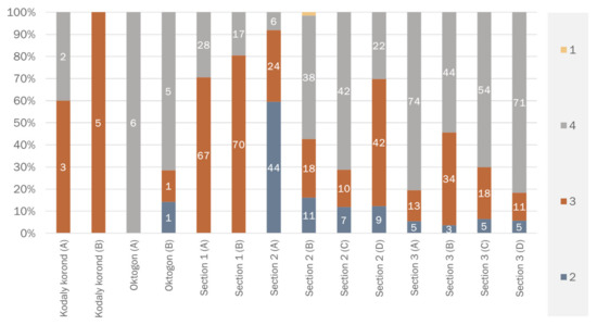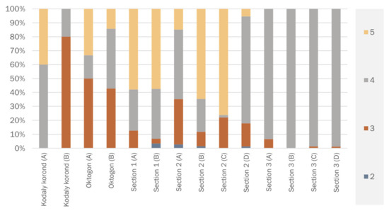 The crown shape and size depends on location and retention condition. If root development is limited, water absorption and the nutrient transition is also limited, and the crown shows a less decorative value than the ideal. A value of 5 is scarce, almost only in the case of a new plantation as in the inner row C in Section 2 (see in Figure 13). Value 2 occurs in some individuals with foliage loss of more than 50% and severe crown damages. Value 4 reflects a good tree stand with a foliage loss of 11%–25%. We found many weak crowns in (values 3 and 2) Section 2 during the survey, where replantation is necessary within five years.