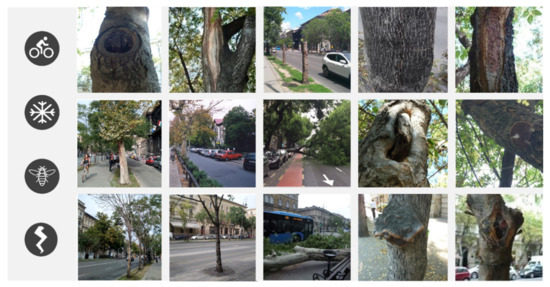 Trees’ damages, diseases and accidental falls. (edited by Szilágyi, Rosa & Lahmar; photo: Szilágyi, Szabó, Rosa, Lahmar, Szaller, 2010, and online source: https://www.fokert.hu/andrassyut/ (accessed on 15 October 2020).