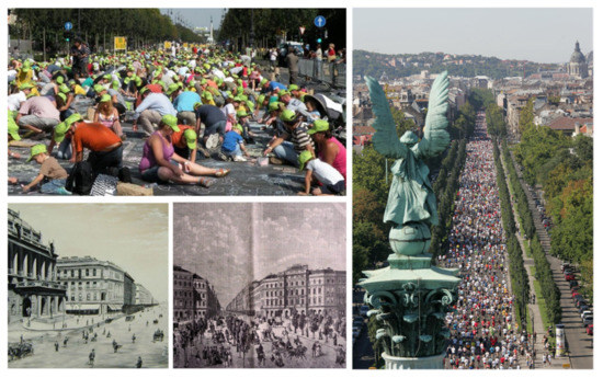 Functions, regular and occasional public use in Andrássy Avenue. (sources: https://timelord.blog.hu/2011/09/15/az_andrassy_ut_az_autosvilag_elott (accessed on 18 October 2020); https://antikterkep.hu/budapest-andrassy-ut-opera-fenykep-1900 (accessed on 18 October 2020)).