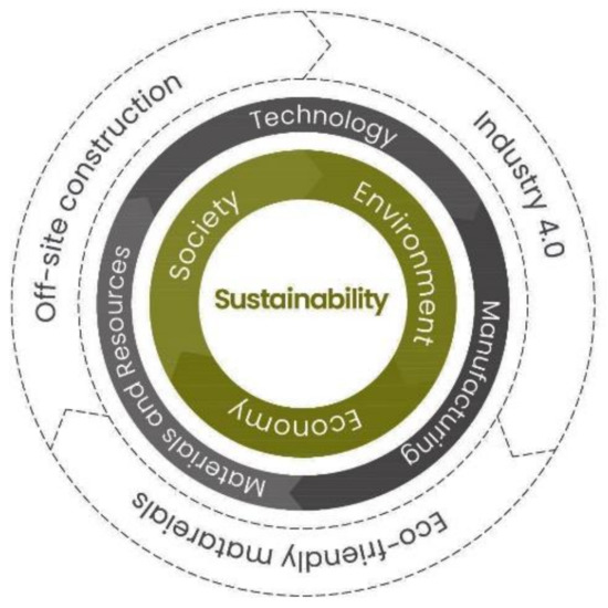 Building sustainability can be achieved with a different approach to technology, manufacturing, and materials, i.e., integrating prefabricated construction with industry 4.0 manufacturing and the use of circular materials [4,19,23].