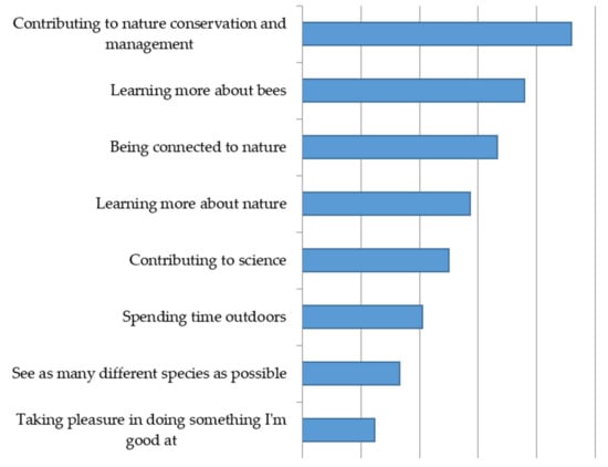 Results of the motivation ranking (Figure 2) demonstrate that conservation concerns arise as most important for the respondents, which corresponds with the emphasis of tNB on halting the decline of wild bees. Respondents also prominently rank their connection to nature and learning about bees as motivating factors. Scientific contributions, spending time outdoors and learning about nature more generally are emphasised somewhat less, while the pursuit of a diversity of species, or the pleasure of doing something you are good at, are given the least emphasis.