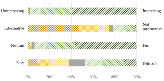 Evaluation of participating in the DNBS. Shades of yellow (checkerboards) indicate responses on the left of the scale, shades of green (diagonals)—responses on the right of the scale, and grey (solid)—the “neutral” middle option. For both green and yellow colours, darker colour indicates increased intensity of the response.
