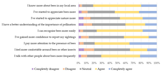 As shown in Figure 4 and Figure 5, the 155 participants in the DNBS reported impressive learning outcomes as a result of their participation. Figure 4 shows that between 71.0% and 81.3% of respondents agreed or completely agreed with the three statements on increased knowledge and awareness of bees, as well as frequency of talking about bees with others. More than half (53.5%) also reported development of a stronger appreciation of bees. We found lower scores for gains in general appreciation of nature, understanding of pollination, and confidence in reporting observations, and we received the most mixed response regarding an increased feeling of comfort around bees or other insects: while 34.2% agreed or completely agreed, 20.0% disagreed, and almost half (45.8%) gave a neutral response. Overall, based on the self-reported perceived changes as a result of the DNBS, it appears that participation was highly impactful for participants, especially in terms of knowledge about and awareness of bees.