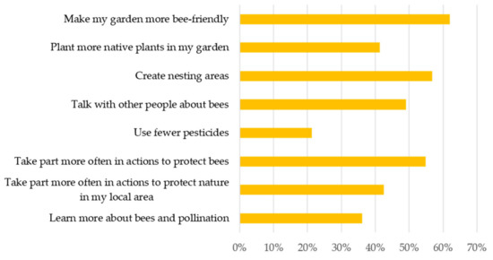 Figure 5 shows that participation in the DNBS also had a significant impact in terms of behavioural intentions. The majority of participants indicate an increased interest in making their garden more bee-friendly (e.g., diversifying plants; 61.9%), creating nesting areas (56.8%), and taking part in other actions to protect bees (54.8%). In addition, more than a third reported a stronger intention to talk with other people about bees (49.0%), take part in actions to protect local nature (42.6%), plant more native plants in their garden (41.3%), and learn more about bees and pollination (36.1%). Only the intention to reduce pesticide use was reported by a much smaller group (21.3%).