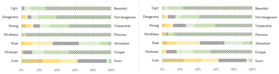 Figure 6 shows the results of the semantic differential items on attitudes towards bees among all 155 participants in the DNBS, both before (left) and after (right) participation. A large majority of participants perceive bees as beautiful, precious, not dangerous, unique, and vulnerable to some degree; a majority considers them cute rather than scary (although with a considerably larger number of neutral responses), and the most mixed responses could be found on the perception of bees as either rare or abundant. As quickly becomes clear from Figure 6, these response patterns are highly similar between both measurement moments. In fact, if we group all yellow (checkerboard), grey (solid), and green (diagonal) responses in Figure 6 and compare the results between before and after the DNBS, the greatest shift is only 7.1% (the percentage of respondents who perceive bees as rare to some degree increased from 34.8% to 41.9%). Overall, however, Figure 6 provides little basis on which to claim that a significant shift in attitudes towards bees took place because of participation in the DNBS.