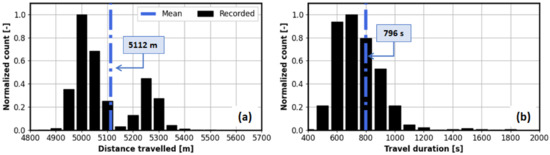 Histograms of (a) distance travelled and (b) travel duration for circular bus route from Figure 2.