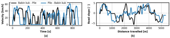 The examples of recorded driving cycles for both driving directions are shown in Figure 4. The road slope profile is reconstructed from the horizontal and vertical components of vehicle velocity by using the Gaussian processes-based method presented in [22,23].