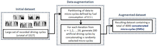 The process of driving cycle data preparation is described by the block diagram shown in Figure 6. For the purpose of well-conditioned training and testing of regression models, the recorded driving cycles are segmented into micro-cycles, where each micro-cycle is characterized by 0.5 L fuel consumption. Then, a rich set of artificial driving cycles based on combining a different number of randomly chosen micro-cycles is generated. More specifically, a total of 4000 concatenated micro-cycles (CMCs) are generated, with distance travelled covered up to 30 km, and fuel consumption from 0.5 L to 10 L. This resulted in a very diversified dataset when compared to the initial one (i.e., the one with the constant distance of approximately 5.1 km, Figure 3a). For the sake of prediction model development, the CMCs are randomly divided into three subsets aimed to be used for the training, validation, and testing of fuel consumption prediction models, with the shares of 70%, 15%, and 15% of total data, respectively. The training dataset is used to learn model, the validation dataset is used for tuning the model hyperparameters and to prevent overfitting (used only for NN parameterization; see Section 4.4), while the test dataset is aimed at an unbiased evaluation of model performance.