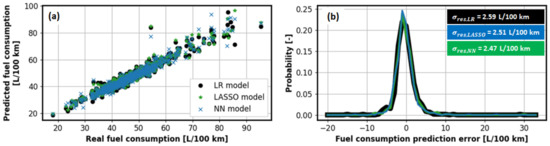 The calculated values of the aforementioned indicators are shown in Table 1. The corresponding plot of predicted vs. real/recorded fuel consumption and respective probability distributions of prediction errors/residuals are shown in Figure 9. These results show that all models have similar error distribution and performance. The NN model is characterised by the highest R2 of 0.942 and lowest of 2.47 L/100 km, thus representing the ultimate prediction accuracy. Although being significantly simpler, both LR and LASSO models follow the NN model very closely, with R2 equal to 0.935 and 0.939, respectively, and being around 5% larger. It should also be noted that the predictions are well balanced, i.e., the mean error is close to zero.