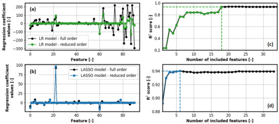 The results further show that LASSO is capable of reducing the initial set of 91 features to 33 ones (i.e., a total of 58 regression coefficients are shrunk to zero). This is illustrated in Figure 10a,b, which show the final values of the regression coefficients for each statistical feature, obtained for initial training of LR and LASSO models, respectively (curves marked in black). Moreover, in the case of counting the number of features for which the condition is met, the number of relevant features decreases from 33 to 21 for LASSO model (−76.9% w.r.t. initially nominated set of statistical features), and from 91 to 77 for LR model (−15.4%).