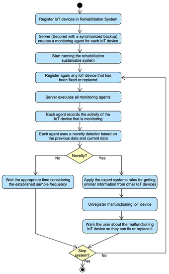 Figure 1 presents the block diagram of the proposed technique for making IoT rehabilitation systems sustainable. This diagram follows the common notation of this kind of diagram, starting with a black dot in the beginning and ending with a black dot with an outer circle for the ending. The flow is indicated with the arrows with some rhombuses for conditional bifurcations of flow. In this technique, first, all the IoT devices are registered. Notice that these will be connected to a server, which has a synchronized copy in another server in case of server failure. The IoT device input will be used the with rehabilitation system depending on the specific application. For each IoT device, the system creates a monitoring agent that analyzes each IoT input in order to detect anomalies for identifying malfunctioning devices. After everything is set up, the rehabilitation system starts. Considering the established frequency of checking, in each iteration the system executes all the monitoring agents. Each agent collects data from the corresponding IoT device in order to confirm a dataset for later running the novelty detector. If there are enough data, it runs the novelty detector to identify whether there is any novelty representing that the device is malfunctioning. This approach is based on the assumption that initially all IoT devices start working properly as this is requested to be checked when setting up the system. In this way, when an IoT device malfunctions, it is usually detected with the novelty detector from its data patterns that it is different from the previous ones. One can observe that the last conditional bifurcation is used to keep a loop for repeating the same iterations over and over until the system is stopped.