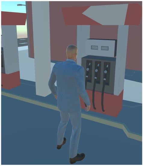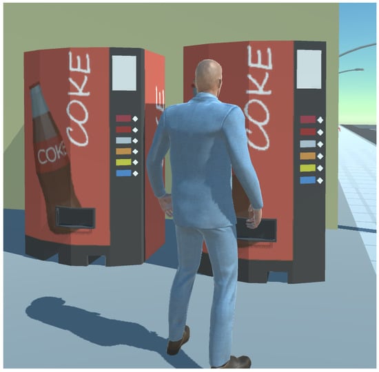 Figure 2 shows the rehabilitation scenario in two drinking machines. In this scenario, a person could practice moving any of the two upper limbs by getting drinks identified by colors. The program indicates a color of a button of the drinking machine and the user should move the arm to get these with the corresponding sensors attached to them. This figure represents a 3D representation developed with Unity 3D, and an avatar controlled by the user, in which the avatar can walk to different city locations for different rehabilitation exercises.