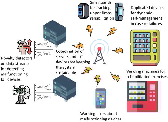 Figure 5 presents the network structure of the proposed approach. As one can observe, IoT devices and servers are connected through wireless antennas. IoT devices such as vending machines and smart bands provide streams of data to the servers, after some basic preprocessing to avoid network overload. The servers run novelty detectors for detecting malfunctioning devices. If any device is malfunctioning, the servers ask another similar device to send similar information about users so that this self-management improves the availability of the sustainable system. In addition, the user is warned through the cellphone so that the malfunctioning IoT device is repaired as soon as possible.