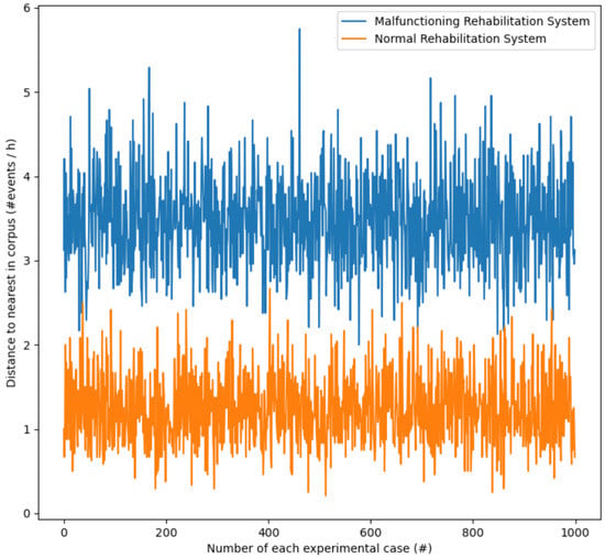 Figure 6 shows the distances in both cases. These are the DTW distances with the previous data assumed to be normal, considering the most similar pattern from the corpus. This is measured with the average number of events per exercise that were registered per hour, considering each event as the extreme position of the limb movement (e.g., highest position in the drinking machine exercise). We hypothesize that normal rehabilitation scenarios do not obtain an exact match with a previous normal case, but the similarity of distance is quite low because the sensors provide similar values for similar exercises considering a representative amount of simulated users processed for the training of the system. However, malfunctioning systems provide very different values, probably because of the differences of values introduced by the simulated malfunction devices.
