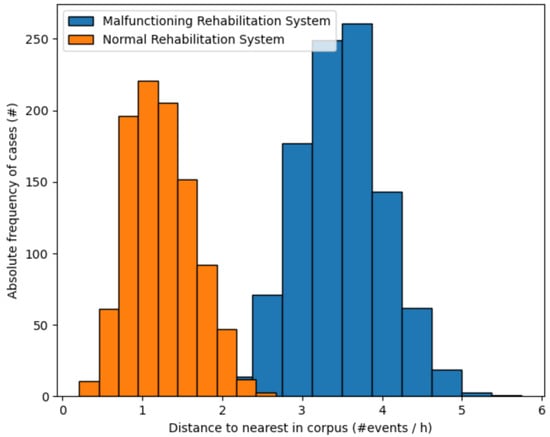 Figure 7 shows the comparison of histograms of the frequencies of the corresponding event ranges. One can observe that the ranges are different, although there is some minor overlap in the range between 2.2 and 2.7 #events/h. This is the average number of events per exercise per hour. Notice that normally each perfectly done exercise takes two extreme positions (i.e., relaxed position and target position, e.g., pushing the button of the drinking machine). However, some users do not get to the relaxed position between exercises or ignore the exercise (this is why the value is lower than two), or they can do several movements (e.g., up and down) before reaching the target (this is why the average can get higher than two). Malfunctioning devices may provide random values and the number of events can substantially increase, as observed in the simulations.