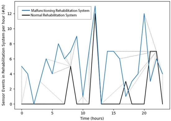Figure 8 shows an example of the application of a DTW algorithm for comparing a malfunctioning rehabilitation system with a probability of failures of 20% per day and a normal system. This graph considers the total number of events per hour in a simulation of a day, considering some hours for performing exercises. The malfunctioning device registers activity even when the user is sleeping, which does not make sense for devices properly working. This kind of pattern and others are detected by identifying novelties from previous daily patterns.