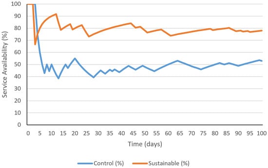 Figure 11, the proposed sustainable approach obtains better results than the control approach, although the difference is not higher than the previous scenario. More concretely, it obtained an improvement of 23.31% in service availability. Thus, for highly error-prone scenarios, the ratio failures did not influence so much the improvement difference of the proposed approach, as it was observed in less error-prone scenarios.