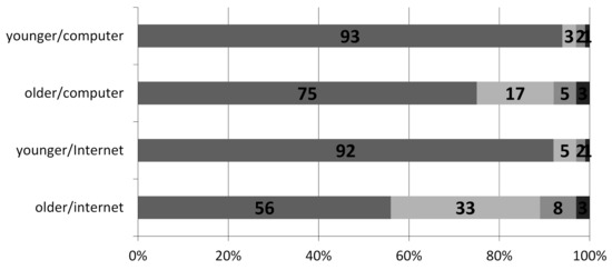 The research results indicate that the “Internet” is a commonly known term today and is most frequently referred to as the “global web”, irrespective of the respondents’ age. The study results for both age groups show that although the percentage of elderly respondents in the group of computer and Internet users is lower than that of younger persons, it is still relatively high. While practically all younger respondents (99%) used these solutions, as many as six out of seven seniors had access to a computer and almost as many to the Internet. The frequency of use of ICT varied by the age factor only to a slight extent (Figure 1). Both older and younger respondents appeared to be using the computer and “surfing” the Internet on an everyday basis.