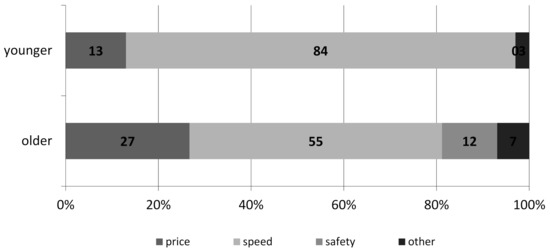 Another category of the potential opportunities and threats involved in the use of ICT is connected with the growing popularity of online shopping and payments. While online banking was used more frequently by younger than elderly respondents (93% vs. 58%), both groups appreciated the same advantages of the electronic channel, namely speed and lower prices (Figure 2). Moreover, the sense of insecurity was the main barrier for using e-banking in both groups.