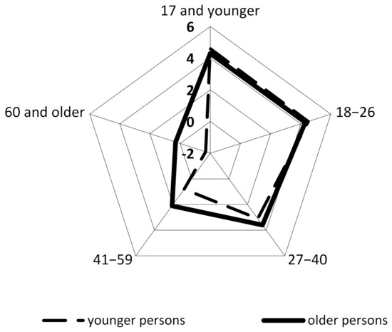 Together with the increase in the age of the studied generations, the average result and the value of the dominating answer declined in both groups (Table 4). A distinctive difference in the respondents’ opinions was observed with respect to the perception of the attitude of the 60+ generation to ICT. According to elderly respondents, while the seniors’ engagement was lower than in the case of younger persons, it was still ranked as positive. Meanwhile, younger persons displayed a more critical opinion of the older consumers’ engagement with ICT, as proved by the predominant answer (−5) and the average result below nil.