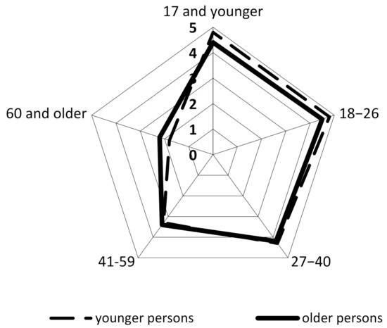 Both studied age groups gave the answer “5” (i.e., agreed completely with the given opinion) with respect to each specified generation. The opinion average indicates, however, a predominance of an earlier opinion, according to which the immersion will decline with age (Table 5).